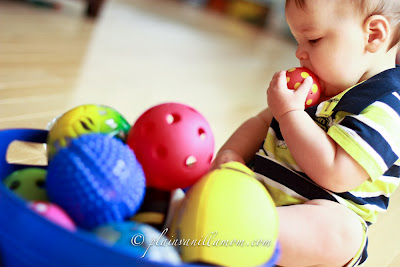 Once he had that out of his system he dug into the ball bin and did play with it for quite awhile. It was actually very interesting to watch because at any point in time he always had two balls in his hands. I could only imagine he was comparing them in his mind because he would keeping looking at one and then the other. He would put one in his mouth and then the other. Once I realized he was likely comparing them I put the camera down and started narrating for him. “This one is smooth, this one is bumpy”. “You have the red ball.” “That’s the blue ball”. He would look at me, and then the balls. So endearing. It actually looked like some of what I was saying was sinking in. (Mommas..talk to your babies while they play…they love it!) I’m sure his little brain was working overtime on this one. All those different textures, sizes and weights had to make for a great sensory experience. I’m loving this stage where he’s starting to interact with his environment more. He’s growing more inquisitive by the day.