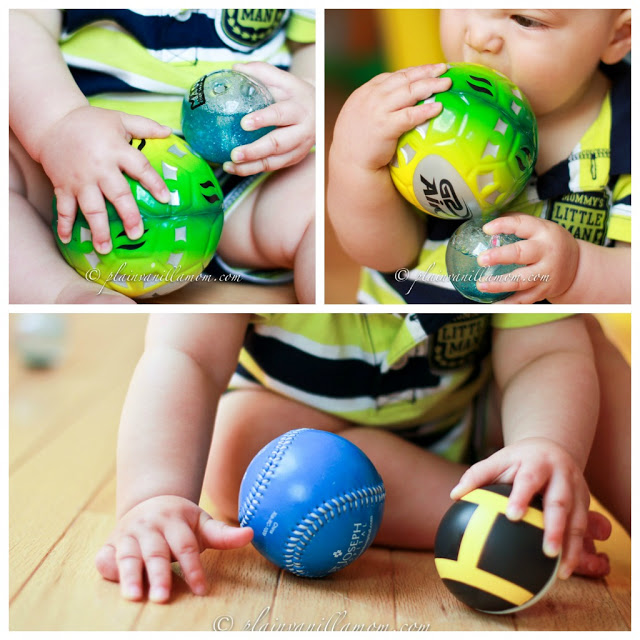 The other day while he was napping I ran around the house and collected every ball I could find, in every texture I could find, that would fit in our wonderful dollar store bin. ( oh how I love those bins! ) There were tennis balls, plastic balls, baseballs, footballs, spongey balls, bumpy balls, and even a couple of big brother’s pokemon balls (shhh…don’t tell, we put them back before he got home from school).