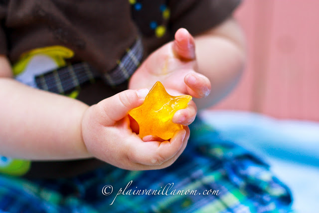 I’m often inspired by the everyday simple things when it comes to thinking up activities for the babe. This time I was inspired by how much fun the munchkin man was having sticking his fingers in his grandmother’s water glass and playing with the ice cubes. I wanted to try it on a larger scale to see if he’d be as interested. I also wanted to dress it up a little bit ;) I had these cute little ice cube trays that I found at the dollar store and knew instantly they would be fabulous for summer fun. The perfect thing to add interest to our ice cube play! As you can see I added food coloring to some of the ice cubes too.