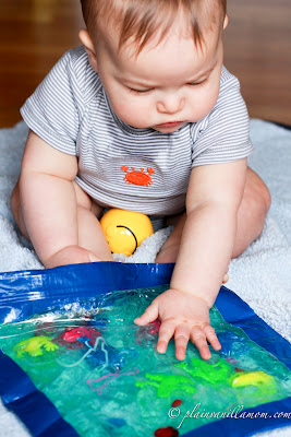 At first Mr. C wasn’t sure what to do with it. He would just look at it and smile. (at least he thought it was pretty). Eventually he did get to squishing it around a bit. He especially liked it when I held the bag up so the light would shine through. I’m thinking the next time I get it out I may tape it on our sliding glass doors so he can look at it and explore that way. Believe it or not, much to my surprise, he didn’t try to put this one in his mouth.