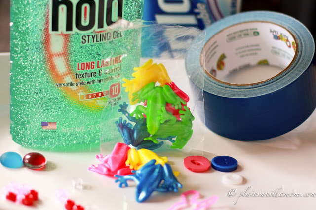 Fill the bag with hair gel. I happened to find cheap hair gel that was already colored, had I not, I would have just added food coloring to regular hair gel. (tip: you can find huge bottles of hair gel at the dollar store… cheap). Then, throw in some fun things for baby to look at and squish around in the gel. Squeeze out as much air as you can when you seal the bag. I ran duct tape around all the edges to reinforce it. The duct tape added a little color and made it look kinda cool too (bonus) That’s it! You are good to go!