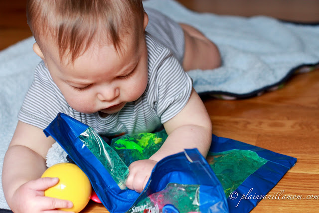 Disclaimer: If you do try this, as with any activity, make sure you supervise your little one at all times. Little fingernails and teeth could puncture the bag. Mr. C was about 8 months old when we tried this for the first time. He was able to sit up well on his own and had good head control when he was on his stomach. I would not recommend this for any infant that can not sit up on their own. Plastic can pose a suffocation risk. In the end you know your child best so please offer activities and supervise accordingly. Safety always comes first.