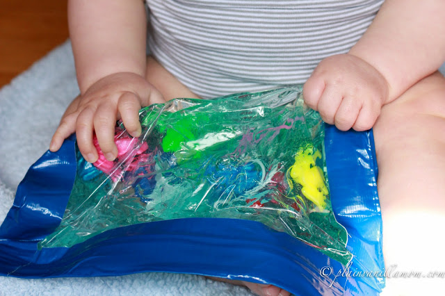 Please note: Before I go any further, the safety of your baby should be of the upmost concern. Please remember that with this activity you are giving a younger child a plastic bag filled with gel and other small items. Not traditionally what we would think of as a “toy” for a baby. Do not leave your child unattended during an activity like this. Safety first, supervise at all times! For obvious reasons you do not want baby putting this in their mouth.
