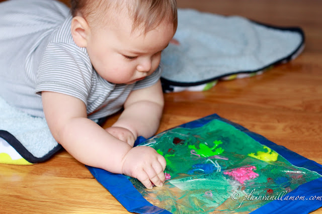 This is by no means limited to the youngest set. I think it would be well suited for a lot of ages. My older son was even intrigued with how I made it, what I put in it etc. If you have a large age gap between kids like we do, sometimes its fun to get the the older ones involved in making these types of things for the younger ones. It gives the older kids a project and everyone gets to participate. (I’m a big fan of older kids with projects). I will definitely be repeating this one as the munchkin man gets older. I’d also like to try making this in a smaller size. I think it would be easier for him to pick up and manipulate. With the hair gel in the gallon size bag it was a bit heavy for him so he was more limited to playing with it like a mat. Please remember though if you do an activity be sure to supervise your child at all times. Plastic bags do pose a suffocation risk and you can never be too careful.