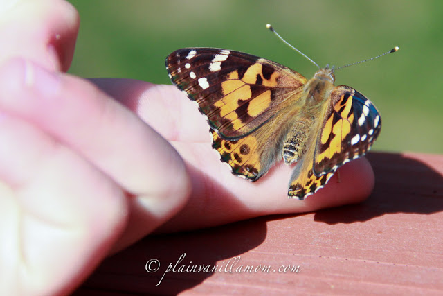 The day we let them go, it really was a beautiful day. Those butterflies were very happy to be set free. As soon as the breeze hit their habitat they started fluttering around like crazy. A few of them flew out right away and a couple needed a little hand from A (which he was happy to lend).