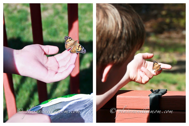 A few weeks ago I introduced you to the caterpillars that were to be our butterfly family of 2012. Well this is the continuation of their story. We had eight caterpillars in all and each of them turned into beautiful butterflies. When I asked Mr. A when he thought we should release them he gave me a day nearly two weeks out! I was not so into the idea of having to feed and maintain butterflies for that long but I went with it. However, about three days in he surprised me. The weather was gorgeous and there was a perfect breeze. We had been playing outside all afternoon after school and when we came in we went up to his room to feed the butterflies. He surprised me by saying “Mom, we should really let them go today… It’s the right thing to do” How sweet. My heart melted just a little bit. Now, hubby will tell you there was a little of (what he calls) jedi-mind tricking going on on my part. You see, while we were outside playing that day I mused about what a beautiful day it was and how much the butterflies would love this kind of weather…