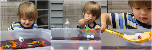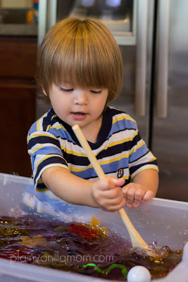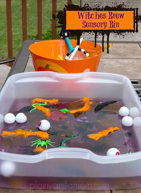 With the unseasonably warm hot and humid days we had here in New England last week, I was trying to come up with something new and fun in the water play department. Given the season "witches brew" came to mind. One of my most favorite memories from Big Brother's preschool years is how much he loved a particular Halloween song he learned... Stirring the Brew. I think there are a couple of variations of it but from what I recall it is something to this affect.