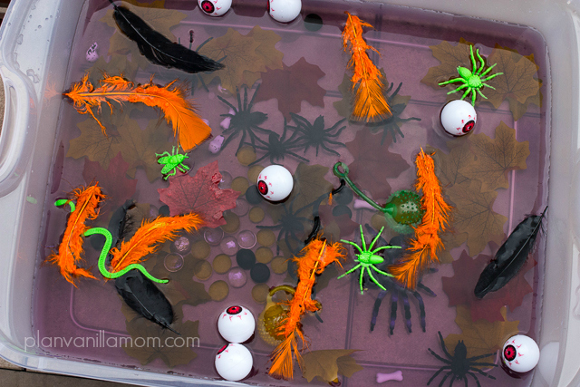 So what did we put in our witches brew? Anything and everything Halloween I could find. My thought process here was the more the better and I wanted lots of different textures. I wanted him to really explore this bin! Here's a peak at everything before the water went in.