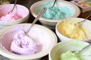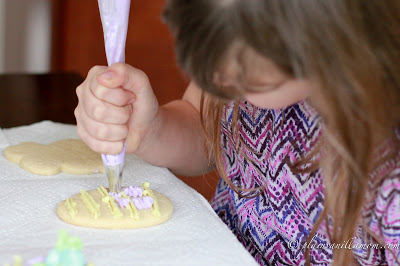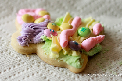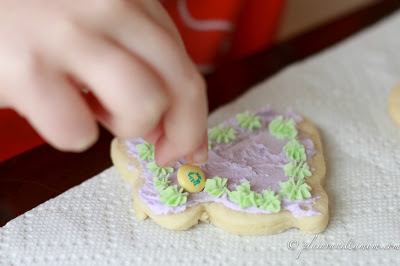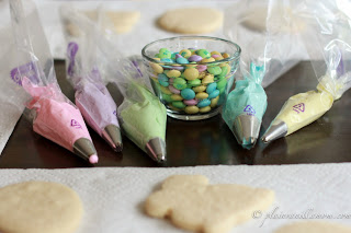 We fill frosting bags and use whatever other garnish I happen to have in the house for decorating. Sprinkles, chocolate chips, mini marshmallows etc. This time it was Easter colored M&Ms.