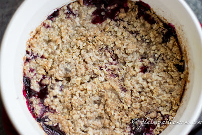 Then mix the oats, brown sugar, flour and cinnamon and cut in the butter until the mixture is coarse and crumbly. Sprinkle evenly over berries.