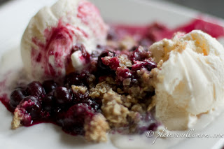 At approximately 5:45pm [Saturday evening] the hubs reminded me that tomorrow is Sweet Sunday. Oops! Totally unprepared. I have not baked a thing all week. I went for my go-to recipe. This is the recipe I reach for EVERY time we are having company for dinner. It’s a simple dessert that always pleases and it’s quick to put together. You can have it baking in the oven while everyone is eating and serve it warm for dessert. As long as you have frozen berries and vanilla ice cream on hand you are good to go. 99% of the time I use blueberries. Blackberries are also very good or even raspberries. You will have to forgive the pictures as I had about an hour to get dinner on the table, throw dessert in the oven, wait for it to be ready, and take some pictures of it all before I lost my light! Somehow I managed to pull it off. I don’t know how food photographers do it. The ice cream was melting faster than I could shoot! No complaints from the hubby tough, he got to eat the mess :)