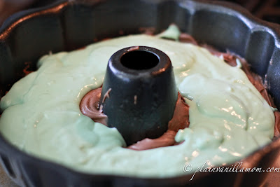 I found this particular recipe back around St. Patrick’s Day but to be honest I baked so much mint/chocolate food I was all minted out so I never made it. I stumbled across this pin on one of my boards the other day and haven’t been able to get it out of my mind since. A serious craving had kicked in! I waited the appropriate amount of days hoping the craving would go away but it didn’t, so I caved, and made this Chocolate Mint Bundt. It was actually very easy to make and it is VERY yummy. Don’t let all the steps overwhelm you, they are all very simple and in the end it’s not very time consuming.