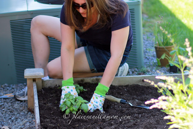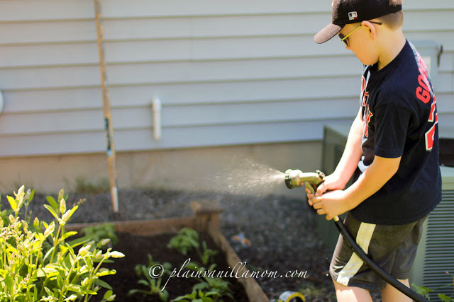 Thankfully we finally had a weekend at home during which I could get ours started. Mr. A helped while the hubs worked on building a new planter for me on another part of the house (more on that later). Planting flowers and vegetables has been a summer tradition for Mr. A and I for as long as he’s been old enough to dig in the dirt. I thought I would share a little of our gardening project with you, now and throughout the summer. I’m sure I can rustle up a recipe or two for you too as we go along using some of our fresh veggies and herbs ;) Something as simple as checking on the garden and watering it is one of our favorite daily activities in the summer months. Hubby and I are fortunate enough that these gardens are right outside our bedroom windows so I get an early peak every morning. It never gets old. We use raised beds that hubs built from kits he picked up at the home depot last year but almost everything we grow could also be grown in containers (and that’s how we did it for a long time).