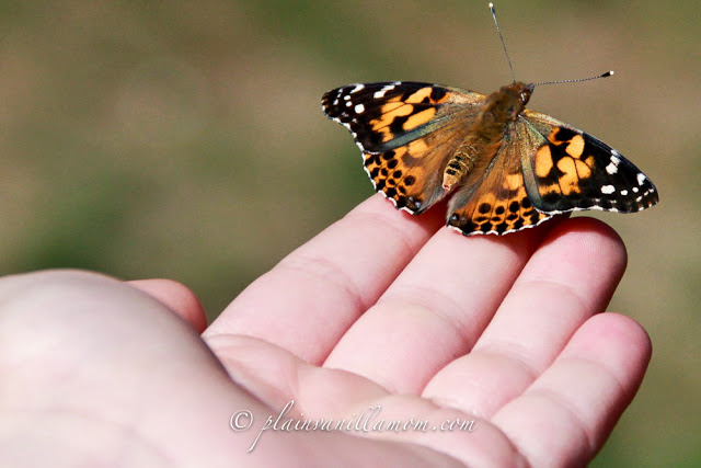 A few weeks ago I introduced you to the caterpillars that were to be our butterfly family of 2012. Well this is the continuation of their story. We had eight caterpillars in all and each of them turned into beautiful butterflies. When I asked Mr. A when he thought we should release them he gave me a day nearly two weeks out! I was not so into the idea of having to feed and maintain butterflies for that long but I went with it. However, about three days in he surprised me. The weather was gorgeous and there was a perfect breeze. We had been playing outside all afternoon after school and when we came in we went up to his room to feed the butterflies. He surprised me by saying “Mom, we should really let them go today… It’s the right thing to do” How sweet. My heart melted just a little bit. Now, hubby will tell you there was a little of (what he calls) jedi-mind tricking going on on my part. You see, while we were outside playing that day I mused about what a beautiful day it was and how much the butterflies would love this kind of weather…