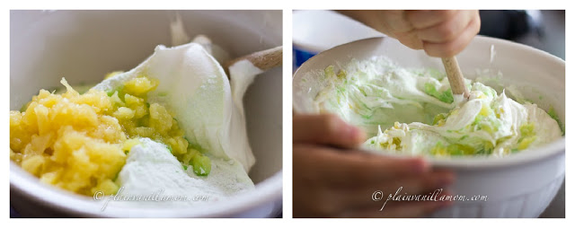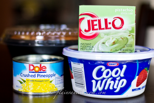 It’s really very simple, and requires no baking what-so-ever. That is unless you decide to make your own angel food cake. Making angel food cake is one thing I’ve never been that successful with so instead of torturing myself I just buy them pre-made. It’s a very light dessert and you only need three ingredients besides the cake. A package of pistachio pudding mix, an 8oz container of cool whip, and an 8oz can of crushed pineapple.