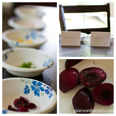 I made it all very official by placing small amounts of a variety of foods in bowls and labeling them. That way after he tasted something he could peak and read what he had tried. He would always try to guess what the food was first which made it even more fun. It was a little more exciting to try something he might not like that way!