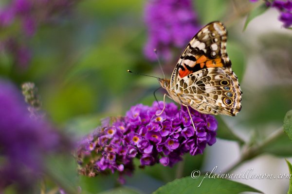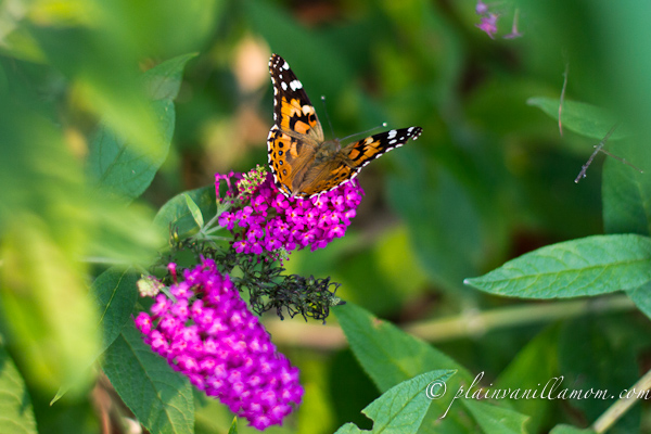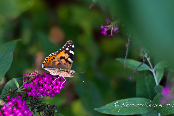 We’ve got a couple of beautiful butterfly bushes that are attracting butterflies left and right this year. I’ve never seen so many. At any given time I can count a minimum of six butterflies out there. Often it’s more. It’s become part of our nightly routine to go out and “visit” the butterflies before we go for a walk. Tonight after the little guy went to bed I went back out with the camera. Notice they are painted ladies? I wonder if they are decedents of the butterflies we raised earlier this year?