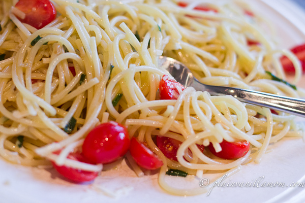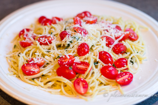 A little fresh basil, a little olive oil, lots of garlic, tomatoes and some parmesan cheese. The only thing missing was a good glass of white wine :) *sigh*