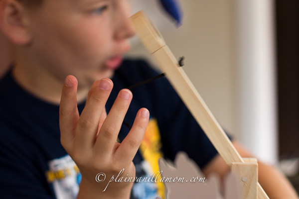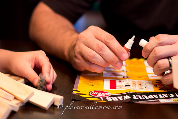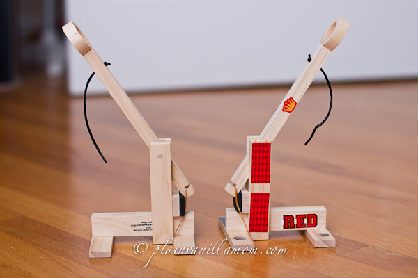 He was so anxious to play with it he didn’t even bother to put the stickers on one of the catapults (and to be honest I’m not sure he followed the instructions when putting the stickers on the other). He did have fun though! It’s a cool little craft, and lots of fun after the fact too. It comes with little bean bags and targets so you can battle but I have to tell you, A thought it was much more fun to just launch the bean bags across the living room floor at the wall in a competition to see whose bean bag could be flung the farthest.