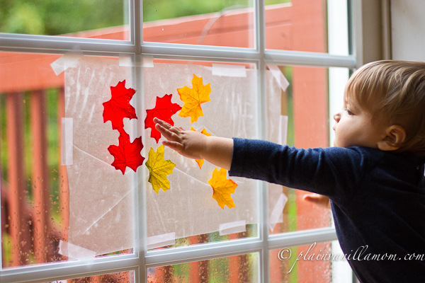 And lastly we tried sticking them to contact paper. I think the contact paper was actually his favorite activity. He was so taken with the stickiness of it that at first he just had fun sticking his hands all over it!