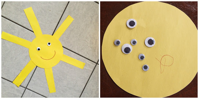 We colored a sun coloring sheet with a yellow crayon. We even did a Mr. Sun art project. I had made a sun before hand to give him something to look at and then gave him the materials to make his own. He was so into the “eyes” that he wanted nothing to do with the other parts of the sun and just put googly eyes all over the place! O-well, we tried!