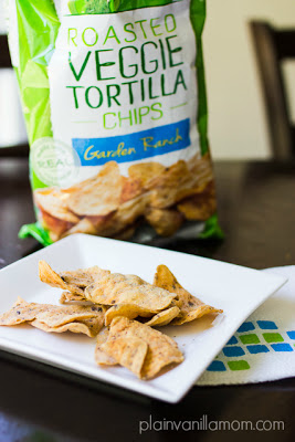 We received the Veggie Tortillas in Garden Ranch and the Sweet Potato Barbecue flavors to try out for ourselves. They also come in Zesty Cheddar and Sea Salt (both sound delish if you ask me). I dove right in to the ranch flavor first. Huge ranch fan here! I typically like sweet potato chips and buy them often but I found the barbecue a little too spicy for my personal taste. I think I would probably like the Sea Salt ones better. I got so caught up in writing and munching I neglected to take a picture until my snack plate looked like this…
