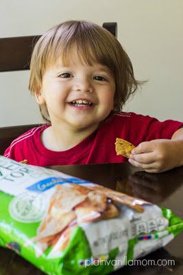 I decided to treat the little guy to a little taste testing/product sampling for his afternoon snack the other day. The subject…Green Giant Veggie Chips of course.