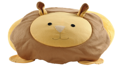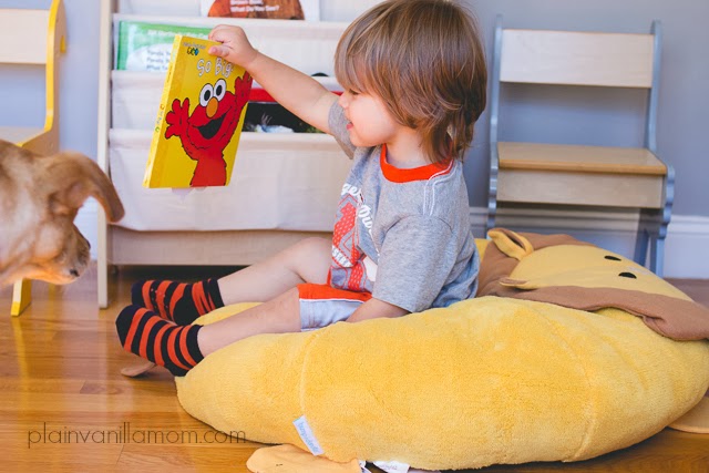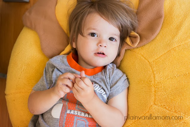 Though he started out living in C’s bedroom he now spends most of his time in our family room or in Little E’s nursery. Mister C loves to hang out with Leonard while I’m nursing the baby. The bumpidoodle has become his go-to spot. He sits on this floor cushion and looks at his books, listens to stories, and just has fun rolling around and jumping on him. Leonard the Lion (as do all regular sized Bumpidoodles) checks in at 30” wide X 24”high X 20” deep. The perfect size for jumping on and snuggling with if you ask C. And he’s light enough for the little guy to lug drag around from room to room.
