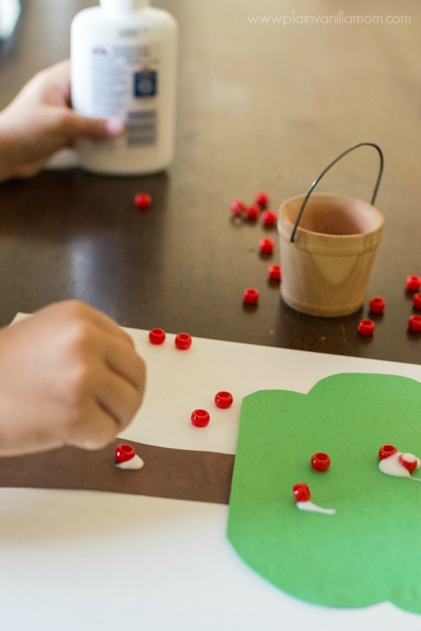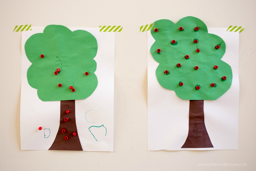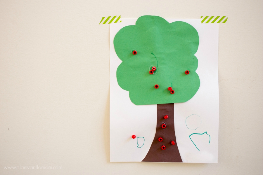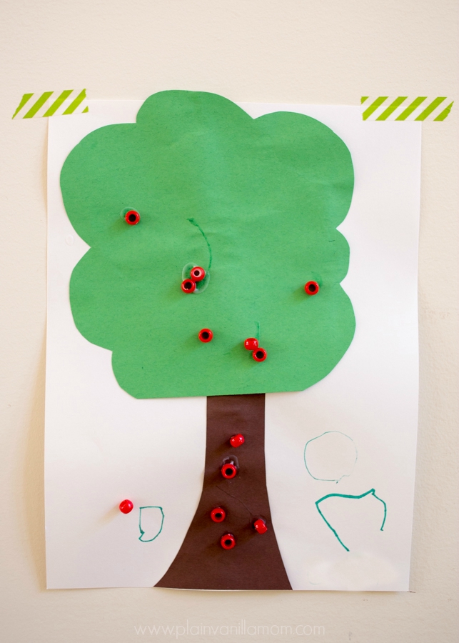 We didn’t even wait for our trees to dry. I gave the little guys the beads and the glue and let them have at it. I love how differently they worked. Mr. C (age 4) was completely independent and loved squeezing the glue and placing beads all around his tree. I especially love how he has apples even falling off the tree. So creative that one. I love his imagination these days.
