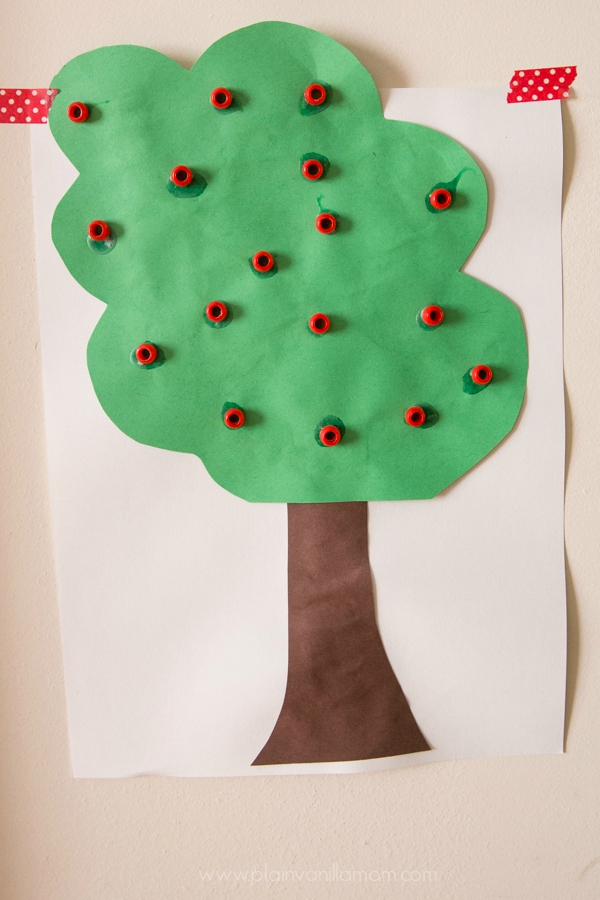 I’m telling ya. This season of life we are in right now is busy, and I don’t often have as much time as I would like to devote to projects for the little guys. That said, I believe it’s still important to do something, however unplanned or planned it may be. So really don’t worry if you are like me and free handing apple trees while the kids clamor around the table. It works, they have fun, you have cute fall art work to hang up around the house. Everybody wins! To make these trees all you have to do is free hand cut some tree trunks from the brown construction paper and some tree tops from the green. Then have (or help) the kiddos glue them onto the white paper. That part takes literally two minutes. Or, now that I’m thinking about it, just scrap the white paper all together. (see I saved you a step). This tree would look adorable as just that… a tree. Better yet do a few trees and create an apple orchard on your wall. What a fun idea! I think I’ll have the kids make more apple trees tomorrow.