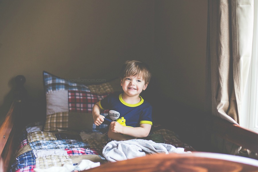Tip: The bed we used is the top bed to a set of bunk beds we were no longer using. It’s perfect for transitioning a toddler into a big kid bed because it already has the rails. We did the same thing with my oldest when we moved him years ago. It worked like a charm then and so far is turning out to be the same experience for C. So tell me. When did you move your kids into a big kid bed? Did you go for the whole room makeover thing and make a big deal out of it or was it more spontaneous? I have to say C is doing pretty well. He’s feeling proud and loving his new bed. We still have his crib in his room as we are trying to get him comfortable slowly. He’s really has mostly been sleeping in his bed since the first night with only a couple of exceptions. He hates change so I’m so afraid when we take the crib out he’ll want it back simply because it belongs in his room. I think that move is on the horizon though. Til then…