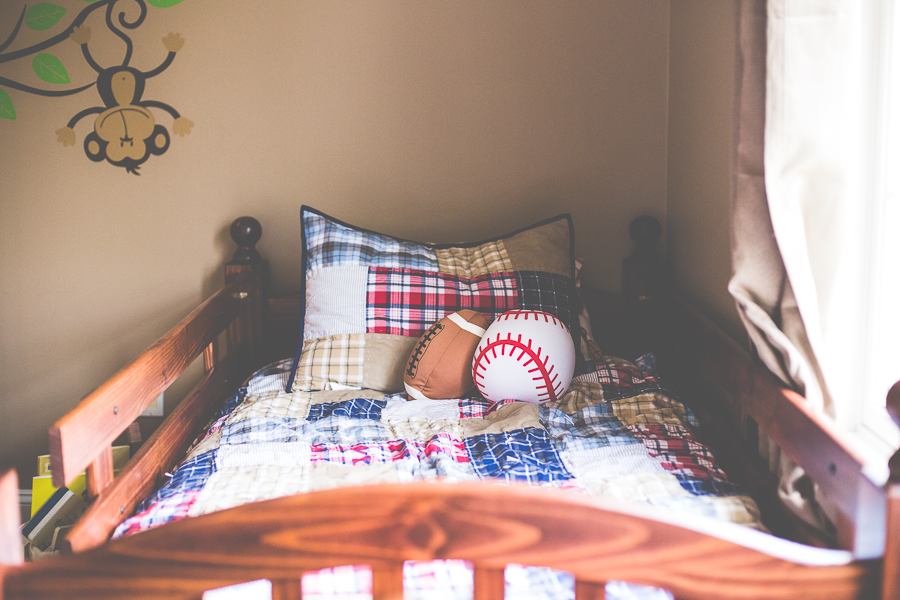 Plaid Quilt (Target), Sports Sheet Set (Target), Rules of the Game Wall Art (Minted.com), Sports Rug (Overstock), Baseball Lamp & Shade (Pottery Barn Kids), At the Ballpark Set of 3 Wall Art Prints (Etsy), Baseball & Football Toss Pillows (Target), Baseball Night Light, Rugby Stripe Lamp (Target) His room’s not totally complete yet. Maybe later this summer we’ll have a big reveal. The wall art isn’t hung and some of his nursery decor (aka: a HUGE tree with monkeys in it) is still up on his walls. I just don’t have the heart to take it down and he really likes the monkeys so I suspect that will stay for awhile. You can actually see a little bit of it in the picture below.