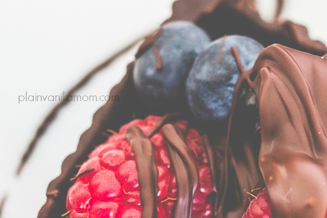 Now, fill your cup with berries and drizzle on more melted chocolate! I used raspberries, blueberries & blackberries because I was trying to recreate what hubby brought home but you could use whatever berry mix you want. I think these would be fabulous with a few strawberry slices thrown in too. Heck, I’m pretty sure you can’t go wrong with whatever you put in dark chocolate cups and drizzle with more chocolate.