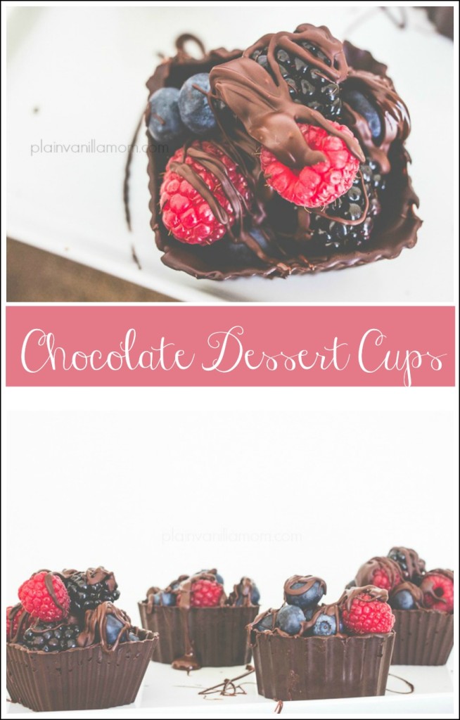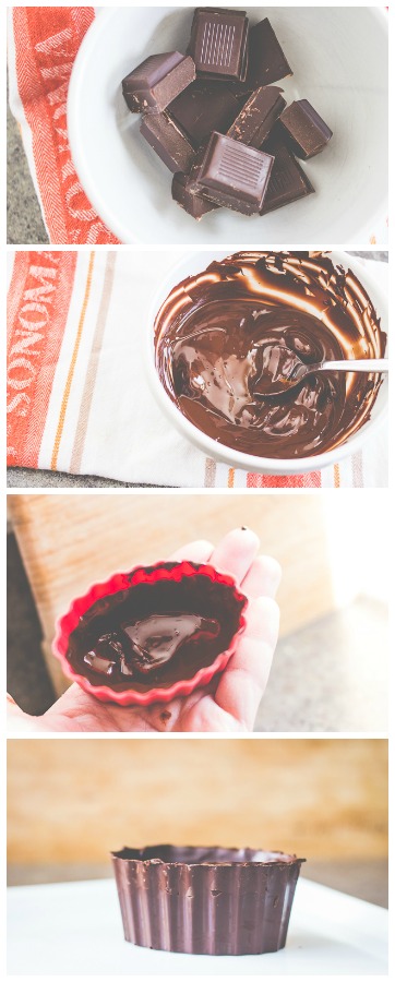 Making the chocolate cups was easier than I thought it would be. I used silicone baking cups for the molds. I tried two shapes, square and oval but ended up liking the square ones best, largely because it made a bigger cup and held more berries. To Make the Chocolate Dessert Cups: