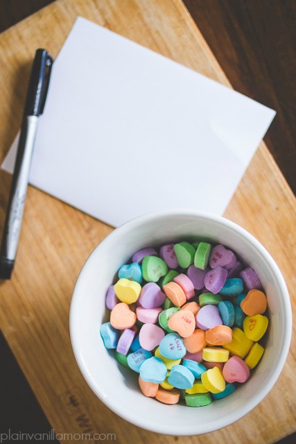 One of my favorite things about Valentine’s Day are those pretty little conversation hearts. I actually can’t stand the taste of them but I love the look. Usually I just buy a bag or two, dump them in a big apothecary jar and put them out as decoration. My next most favorite thing to do with them? Write love notes.