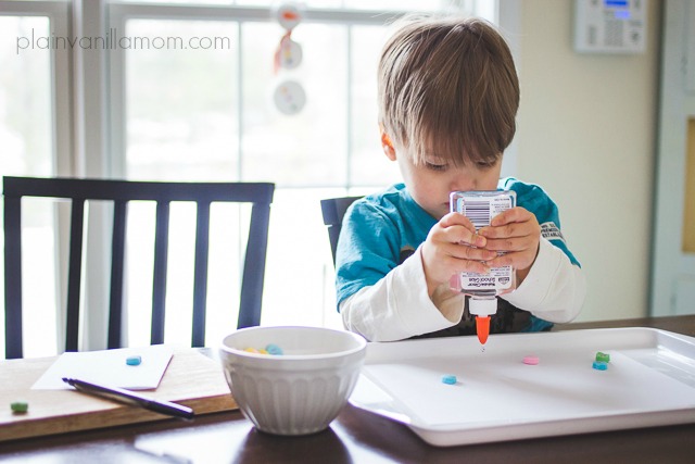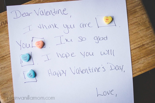 My oldest has been crafting conversation heart notes for awhile now and Mr. C…well he just likes gluing the hearts on paper. If your child is somewhere in between in terms being able to construct the entire note for themselves try using a mad libs approach (see below photo).