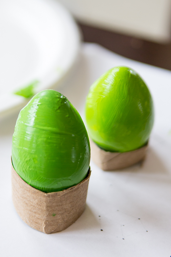 His idea was to decorate them… Minecraft style. Minecraft Easter Eggs if you will. Given his love of all things creeper this was really no surprise. I asked him what he needed. It was fairly simple. A couple different shades of green paint, a paintbrush, and a black sharpie. Fantastic, couldn’t be easier! I set him up with his materials and let him get creating. First he painted the eggs a couple different shades of green. When they were dry he used the black sharpie to draw on their faces.