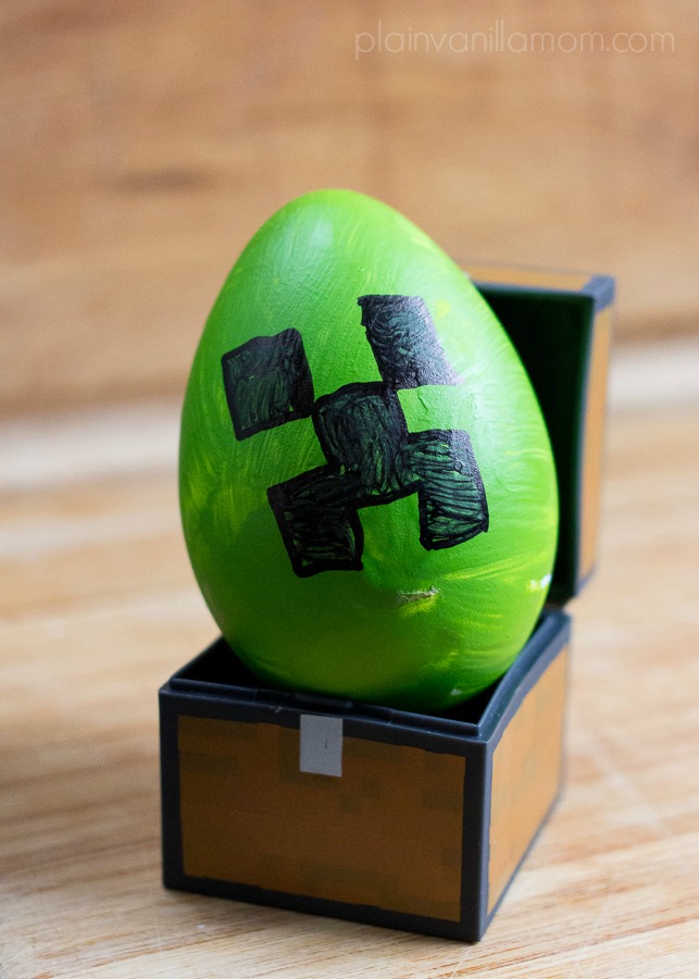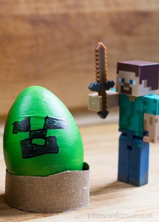 That’s it! Easy peasy. But the payoff was huge. Here are the final results. Creeper and Zombie Minecraft Easter Eggs. He was really pleased with the results. I am too. I’m actually really excited about these. I think he did a fantastic job! They look great and they are even cuter when set up in little scenes with some of his other Minecraft figures. (although don’t tell him I called them cute because that’s probably the wrong word to use when referring to a zombie).
