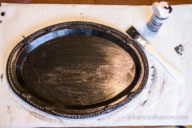 To begin, prep your trays by giving them a good wash with warm soap & water . Make sure they are thoroughly dry and then paint them with the black paint. I used two coats of paint letting them dry about an hour in between coats.