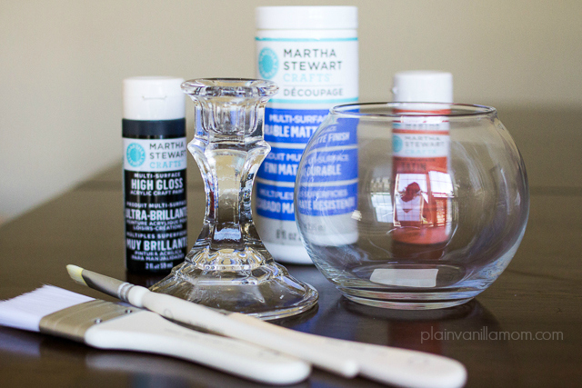 Ok, now that you have the hang of it here’s a quick treat bowl you can whip up to pair with your serving trays. The glass bowl/vase and candlestick holder both came from the dollar store as well. For this you will need the bowl and candlestick holder as well as Martha Stewart Multi Surface Acrylic Craft Paints in Black and Adobo, and Martha Stewart Crafts Multi Surface Decoupage in Durable Matte Finish.