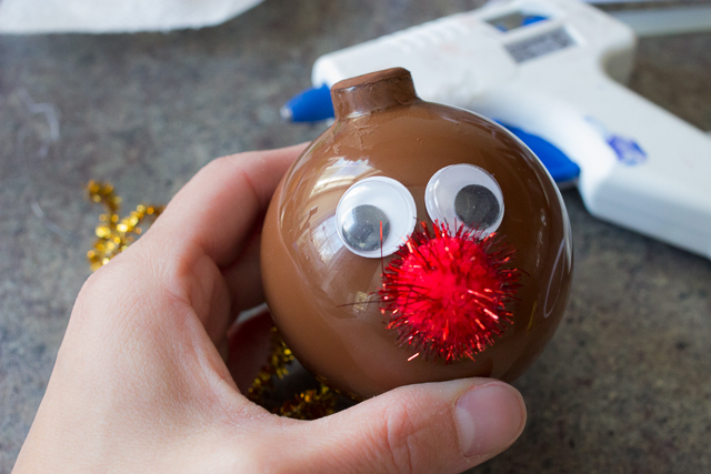 Once it’s dried a bit, hot glue the eyes and red pom pom to make the face.