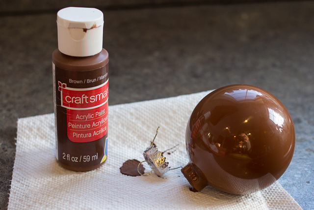 To make this adorable little fellow start by pouring a generous amount of brown paint inside your clear glass ornament. Then, holding a paper towel over the top of the bulb, swirl twirl and shake your ornament until the inside is completely covered with paint. Leave the top off and set it upside down to dry (I left ours overnight) before putting the top back on.