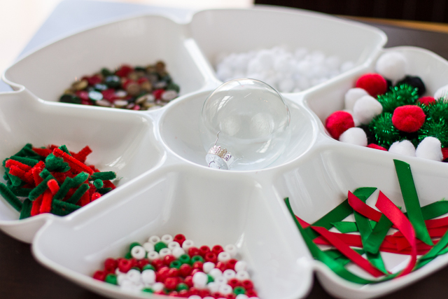 For filler we used cut up bits of Christmas ribbon, pom poms in Christmasy colors (the sparkly pom poms looked awesome), beads, buttons, and cut up bits of pipe cleaner. You could also use small jingle bells or different types of table scatter. Anything that feels Christmasy to you and can fit in the ornaments is fair game. I didn’t go buy anything special for fillers I simply used what I had on hand.