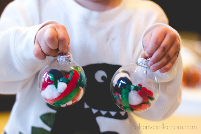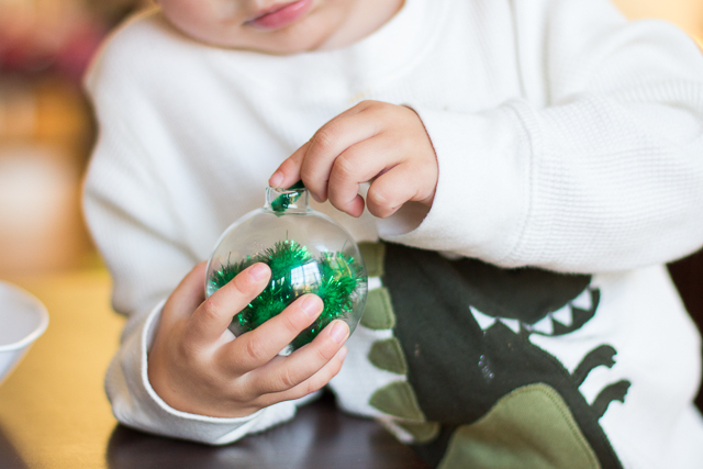 As for making the ornaments all you need to do is take the tops off, let your little one fill as they wish and then pop the top back on. I set a tray out with all the fillers and some ornaments for C to find one afternoon when he got up from his nap. He really didn’t need any prompting and knew just what to do. All I had to do was show him how to pull the top off the ornament. He filled 4 ornaments without tiring in our first sit down and he’s made a few more since then.