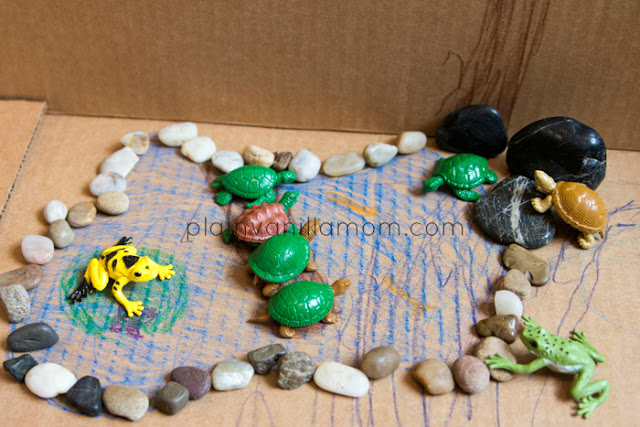 Inspired but our walks at the local park to look for turtles, I drew a log in the pond and we put the turtles on the log. We always find them on a log sunning themselves and count them. So, we had turtles sunning themselves in our pond and counted them. He put frogs on lily pads and turtles on rocks. We even put rocks around the pond. It was such a cute little scene.