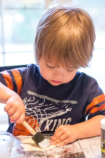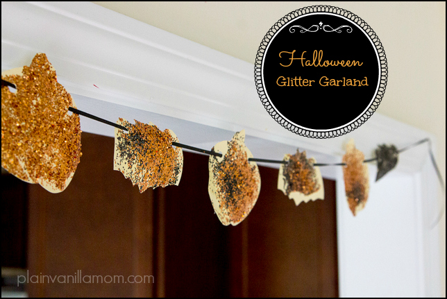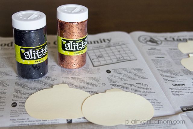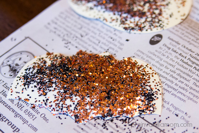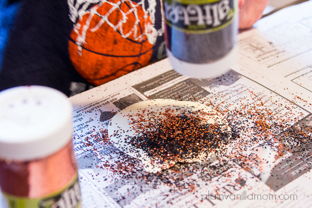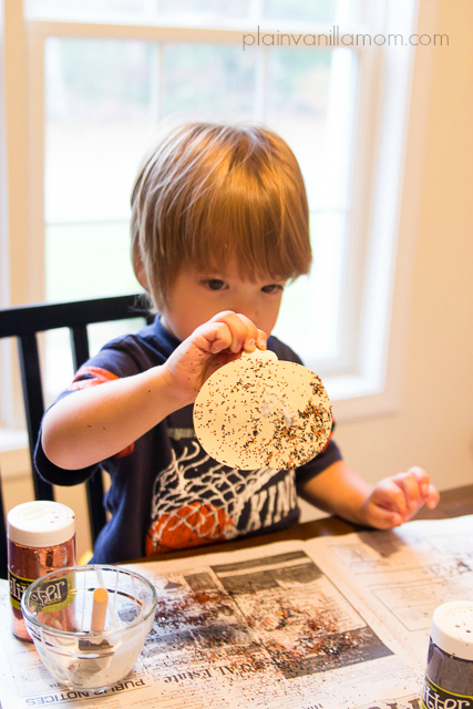We are still cranking out the Halloween projects around here. With only a week left until Halloween we are out to make the most of it. It’s one of my favorite themes of the year for projects! In fact I hope to bring you a few more before the 31st rolls around. It’s been a long time since I’ve done anything using glitter and in fact, I do believe this was Mr. C’s first experience with it. The hubs is traveling this week and since it’s not his favorite thing in the world I figured what better time to break out the glitter. (At least I have until Friday to clean up the mess. haha!)