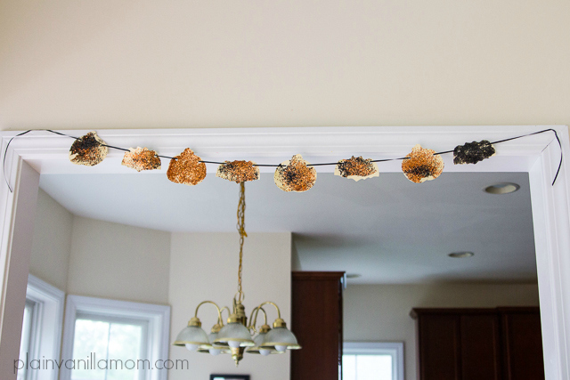 My only regret is that I didn’t cut out more shapes for him. We ran out of shapes before C was ready to be done decorating. They were so pretty! I decided to string them together into garland. I used a hole punch to punch the holes and strung them on black ribbon. Nothing super fancy but C was so happy to see his glitter shapes turned into this…