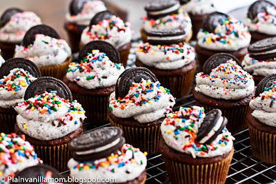 Well…here you have it! Happy Birthday Oreo. A cookies and cream cupcake topped with Birthday Cake Oreos and SPRINKLES!! oooo - pretty! See!! Little bits of cuteness that suck you right in? haha :)