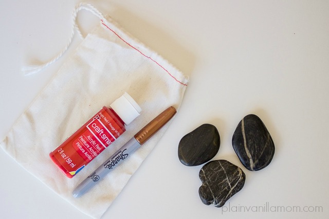A few flat rocks, a small muslin drawstring bag, red paint & a metallic sharpie.