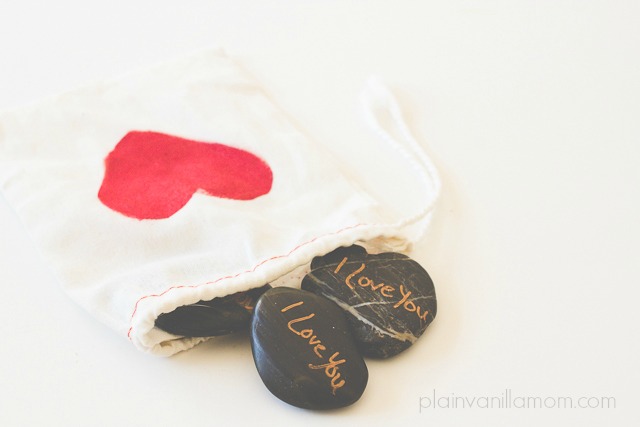 Occasionally I like to remind him just how much I think he rocks. (How did I get to be such a lucky gal anyway?) Valentine’s Day is the perfect excuse, so I put together this little bag of ‘love rocks’ to remind him.